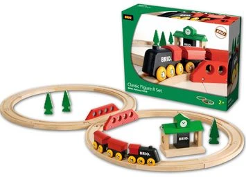 A classic starter set for the 2 year + child with all wooden details. Take the classic inspired engine out on an adventure along the tracks. Stop by at the all wooden station and continue along the tracks passing by trees and a crossing bridge. Lots of fun for the youngest drivers! Ages 2+.