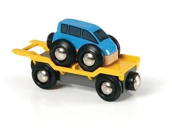 BRIO — Car Transporter — Add this car transporter to your Railway world complete with a brand new BRIO car. Let the car drive on and off the transporter by tilting the wagon ramp. Attach two or more transporter wagons for added fun _ the cars can then drive from one wagon to another. Ages 3+