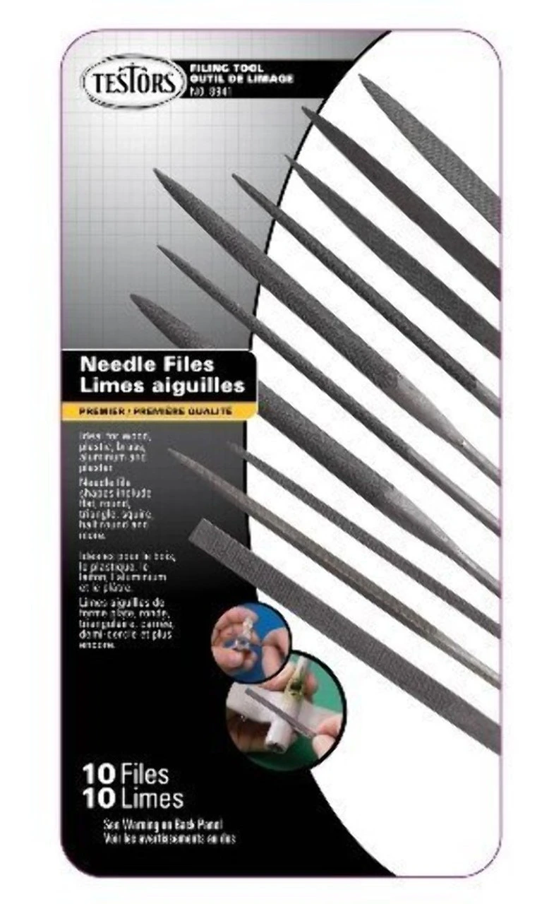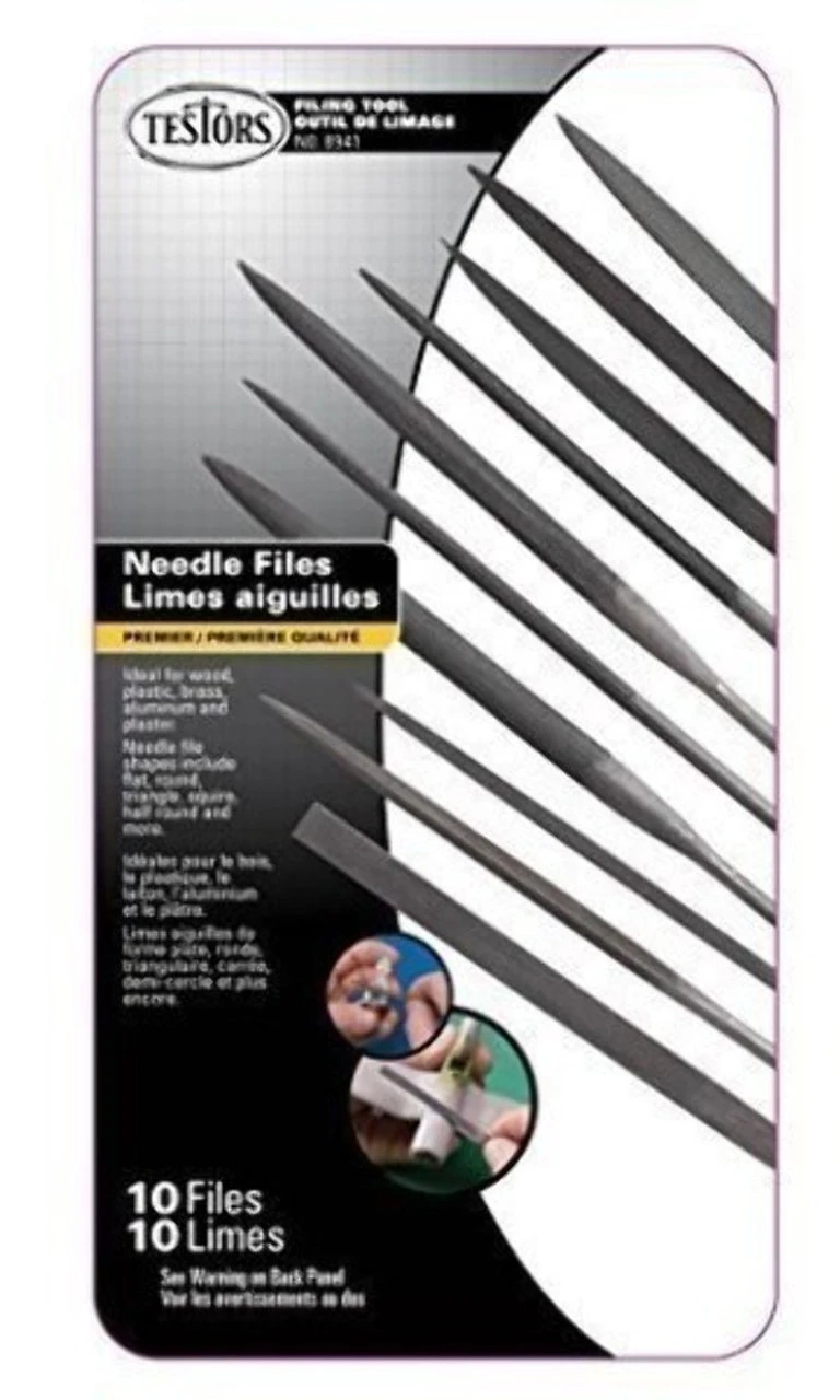 This is the 10pc Needle File Set from Testors FEATURES: 10pc needle files including shapes liek flat, round, square, triangleand more. . Ideal for wood, plastic, brass, aluminum, and plaster YOU WILL RECEIVE: 10 assorted needle files REQUIREMENTS: Nothing JMLM 2/10/11 &