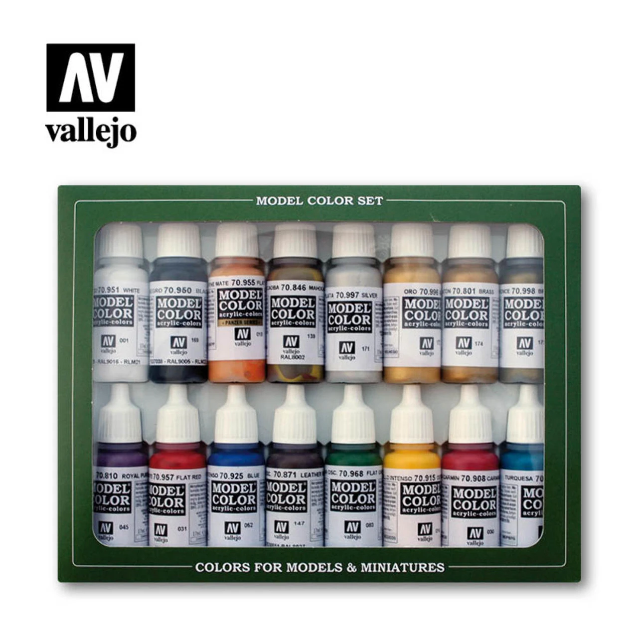 Set of 16 Model Color references for painting models, figures and dioramas. Contains 17 ml./0.57 fl.oz. (with eyedropper) bottles and a color chart.